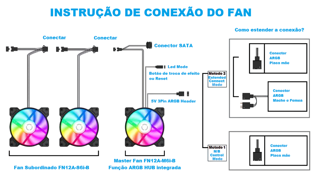 HUB ARGB integrado. Este modelo incorpora um chipset progamado para controlar os efeitos como uma controladora, ou sincronizar com a placa mãe.