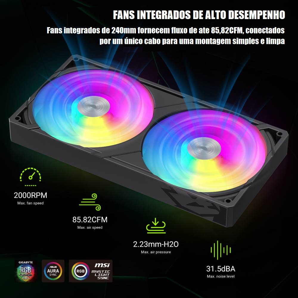 • Ventoinha integrada de alto desempenho: As ventoinhas integradas de 240mm fornecem fluxo de ar de até 85,82 CFM e pressão estática de 2,23 mmH?O, todas conectadas por um único cabo para uma montagem mais limpa e simples.