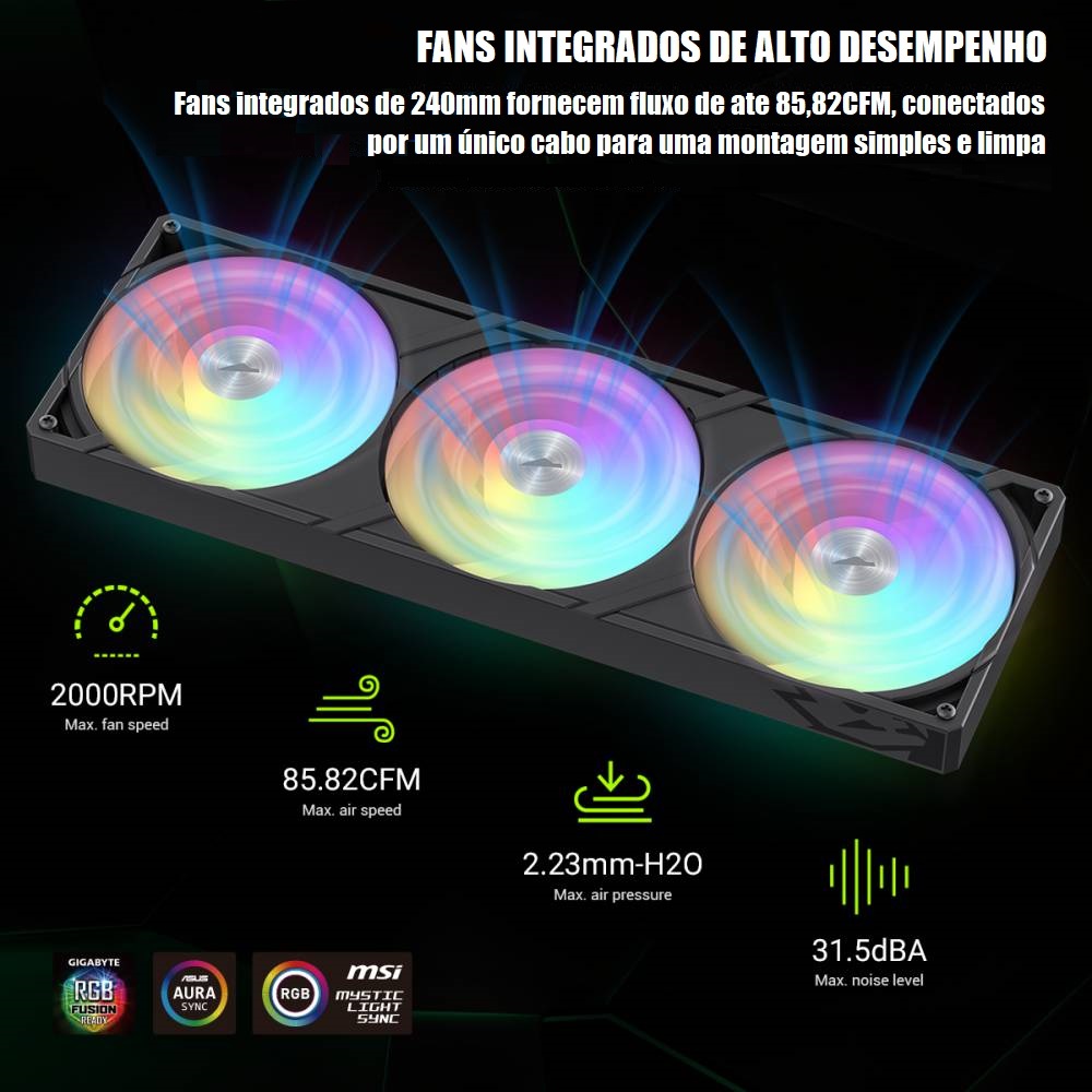 • Ventoinha integrada de alto desempenho: As ventoinhas integradas de 360mm fornecem fluxo de ar de até 85,82 CFM e pressão estática de 2,23 mmH?O, todas conectadas por um único cabo para uma montagem mais limpa e simples.