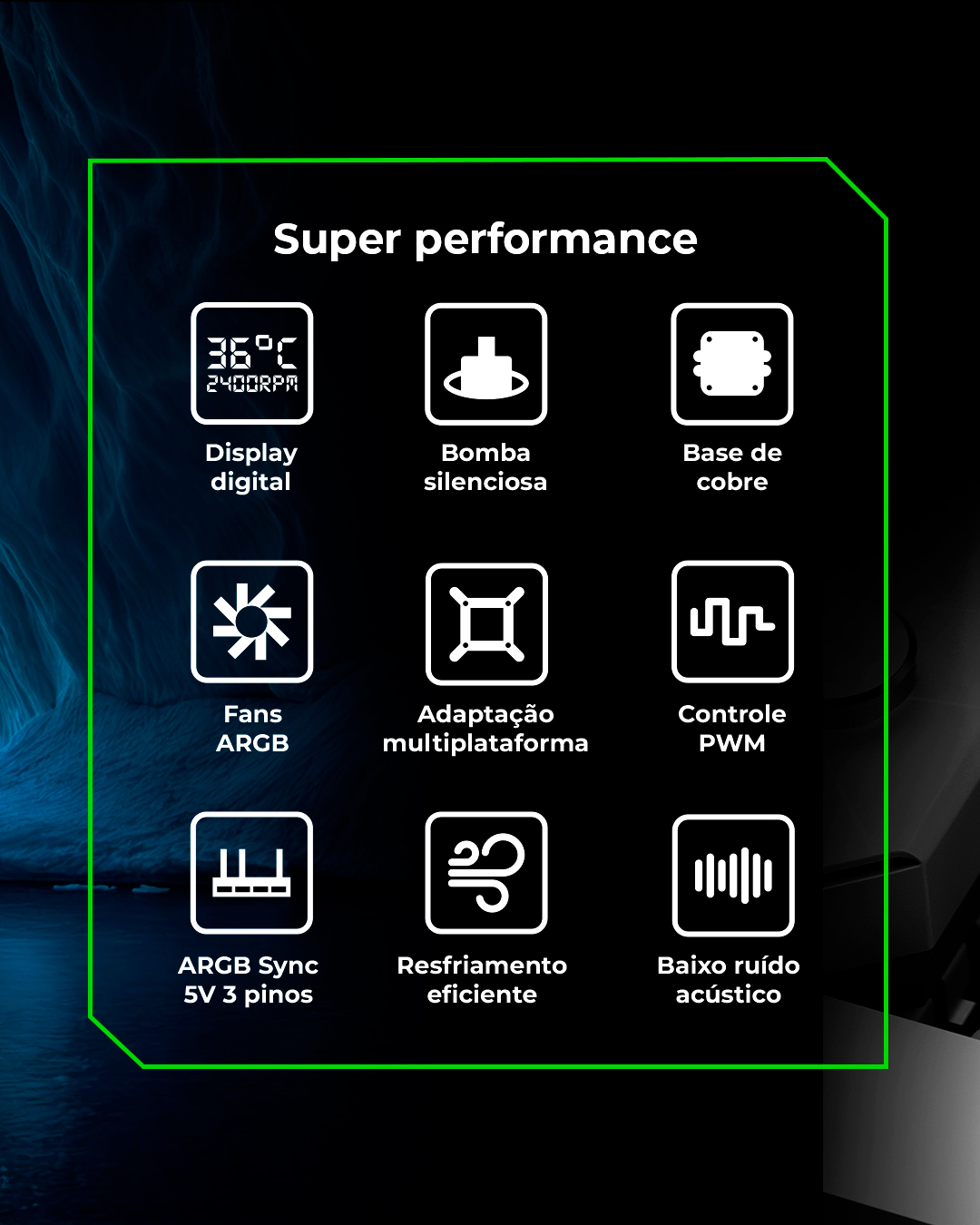 • Sincronização ARGB: Iluminação personalizável que sincroniza com a placa-mãe ou controladora ARGB 3 pinos 5V.